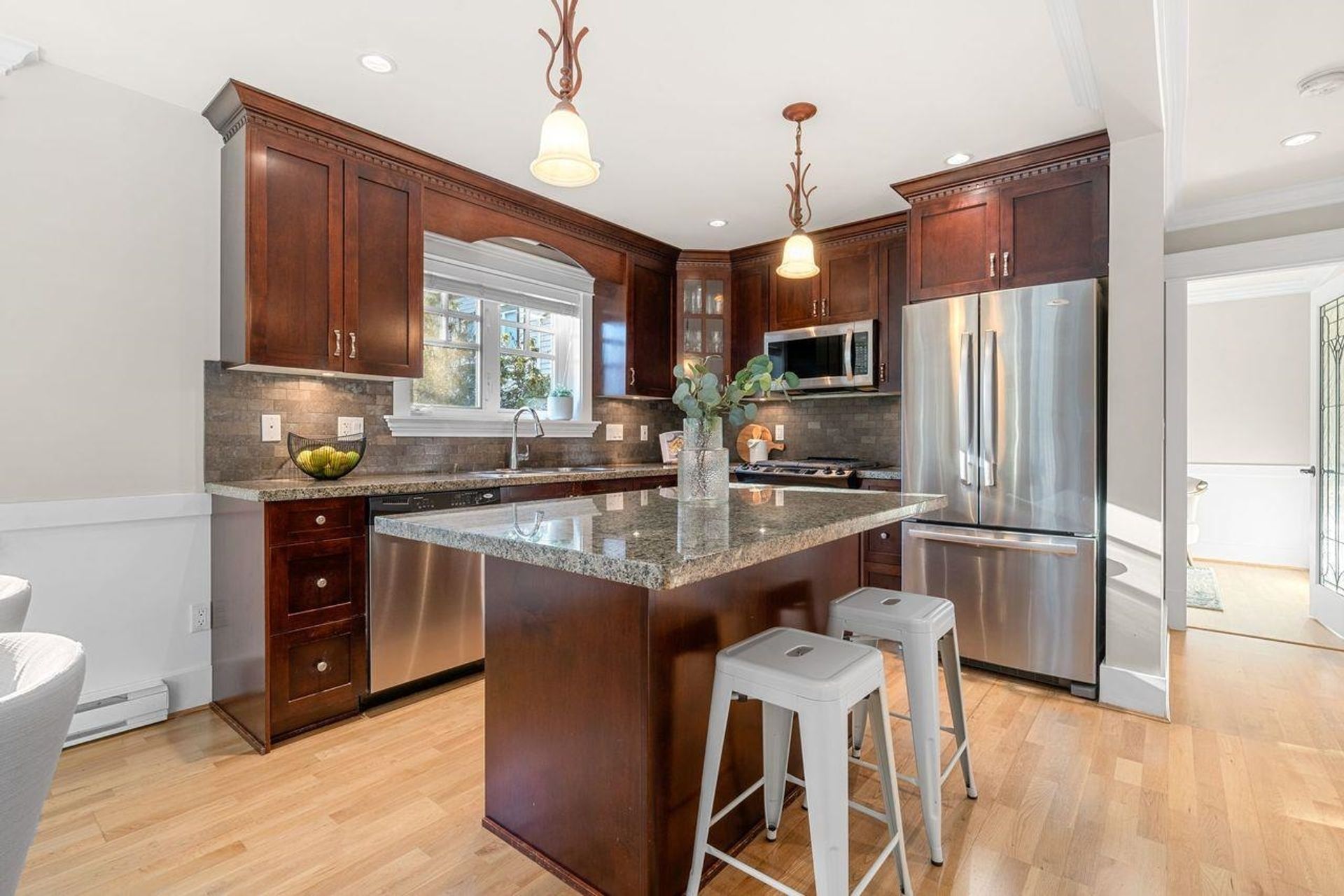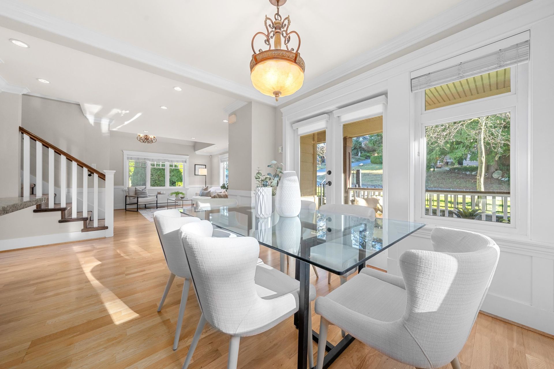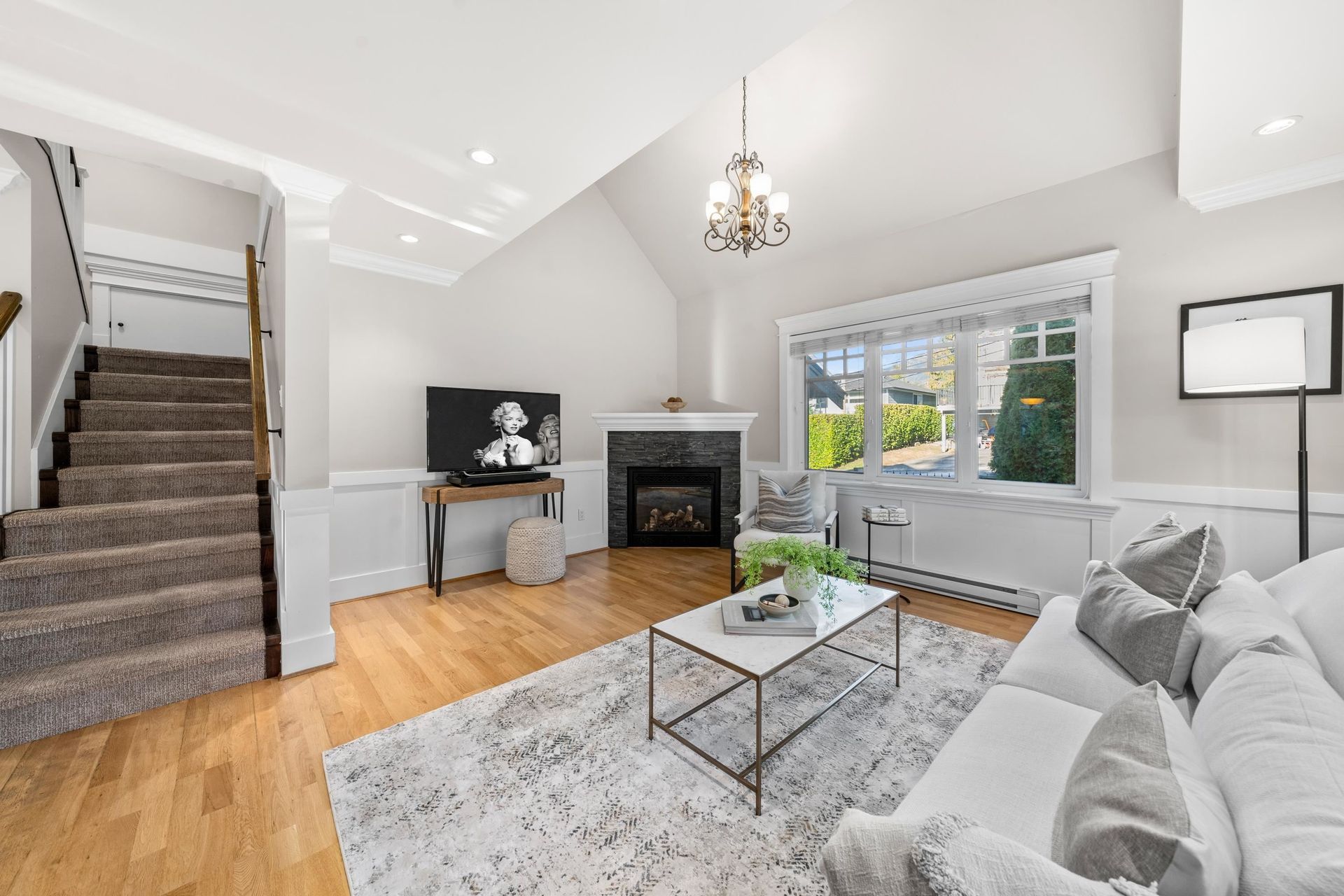 Welcome to The Corner House - a charming Upper Lonsdale home, centrally located near Edgemont Village, Grouse Mountain, Lynn Valley & hiking trails. Beautiful wainscoting adds timeless design to every room. The cozy living room features a gas fireplace and flows seamlessly into an open plan kitchen, ideal for gatherings. The top floor boasts 3 bedrooms with vaulted ceilings and mountain views, while the main floor includes a versatile 4th bedroom that doubles as an office. A 2-bedroom income suite offers rental potential or extra space for family. Attached two-car garage with ample storage. This low maintenance 3300 sq.ft property means less time landscaping and more time for the things you love. Whether you’re starting fresh or downsizing, The Corner House has it all under one roof!