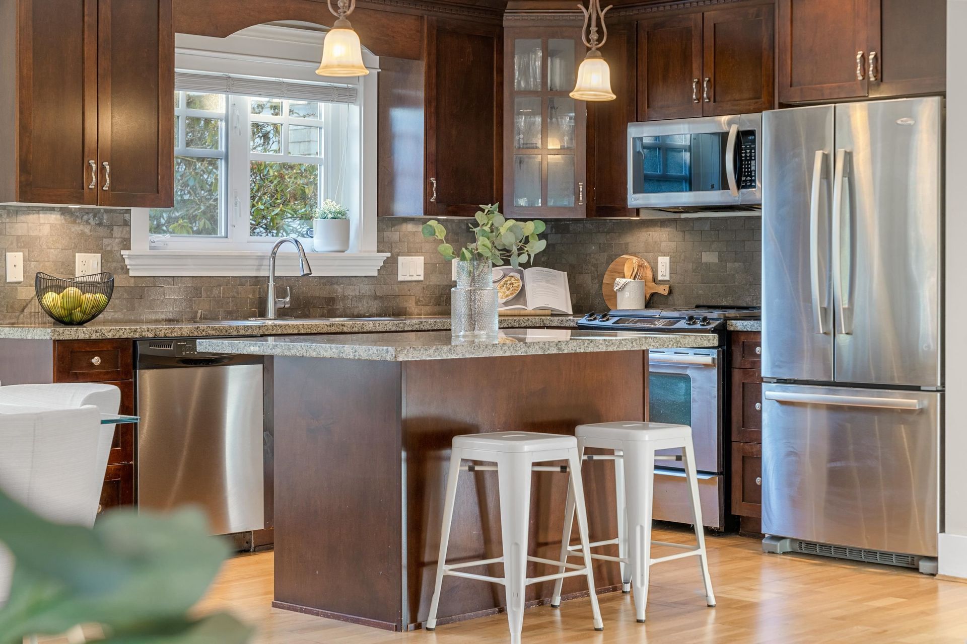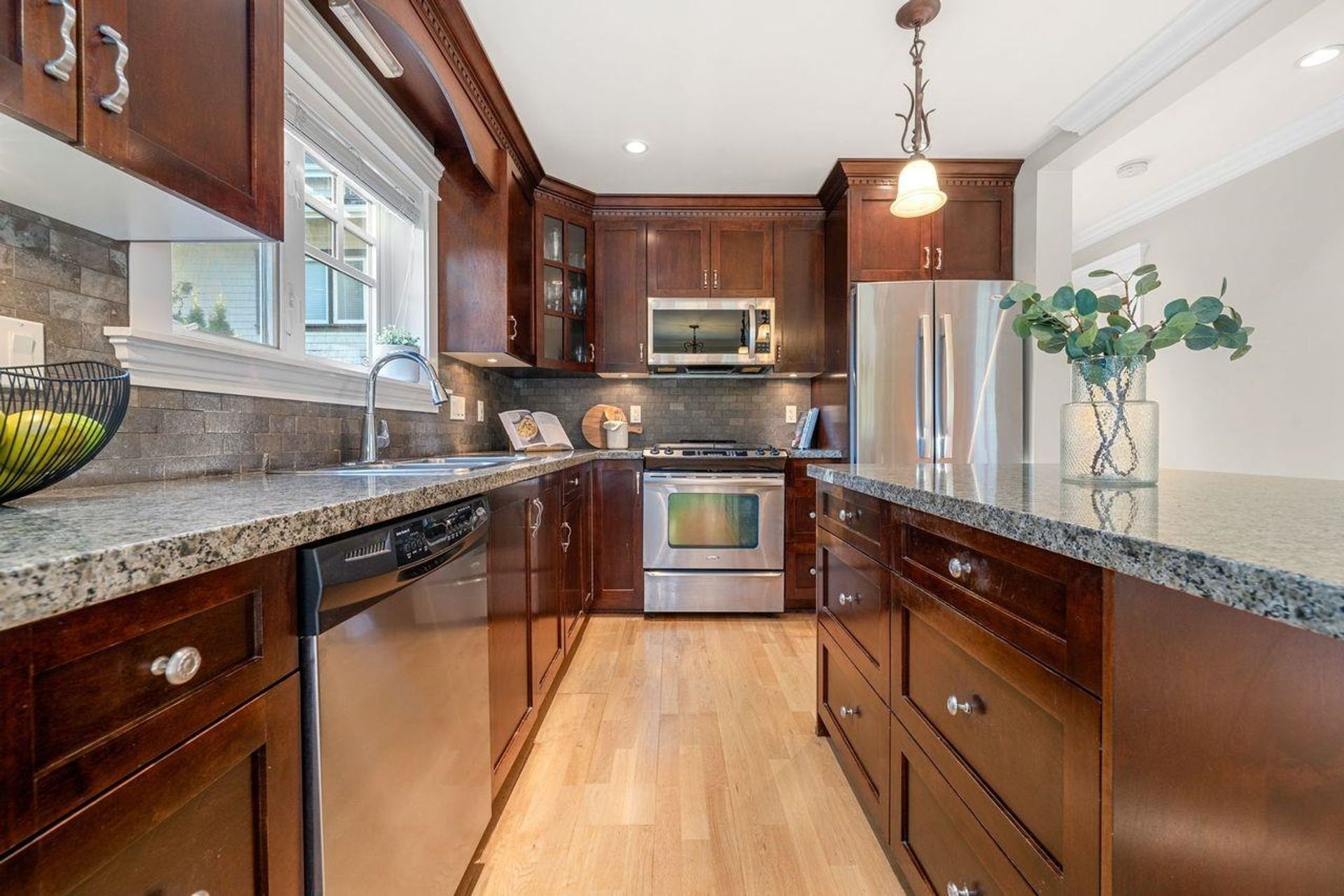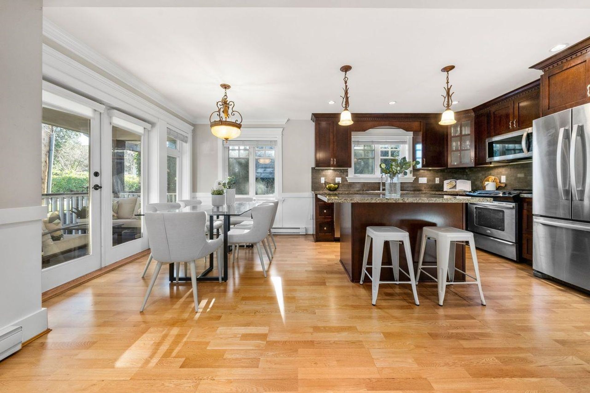 Welcome to The Corner House - a charming Upper Lonsdale home, centrally located near Edgemont Village, Grouse Mountain, Lynn Valley & hiking trails. Beautiful wainscoting adds timeless design to every room. The cozy living room features a gas fireplace and flows seamlessly into an open plan kitchen, ideal for gatherings. The top floor boasts 3 bedrooms with vaulted ceilings and mountain views, while the main floor includes a versatile 4th bedroom that doubles as an office. A 2-bedroom income suite offers rental potential or extra space for family. Attached two-car garage with ample storage. This low maintenance 3300 sq.ft property means less time landscaping and more time for the things you love. Whether you’re starting fresh or downsizing, The Corner House has it all under one roof!